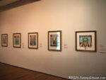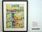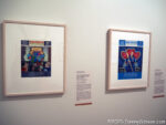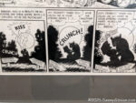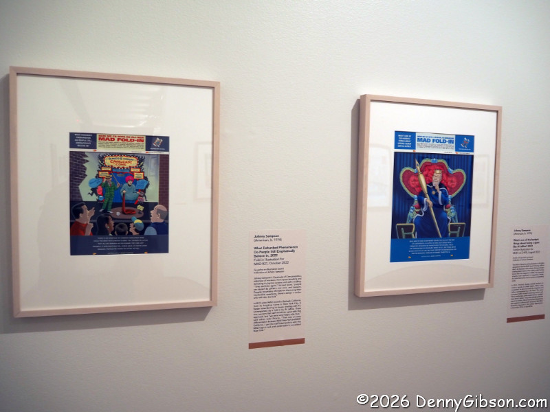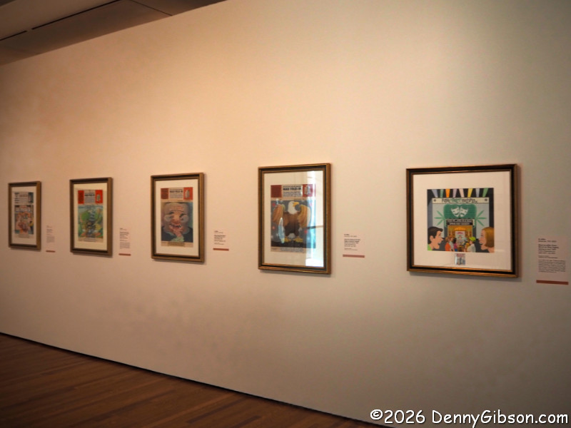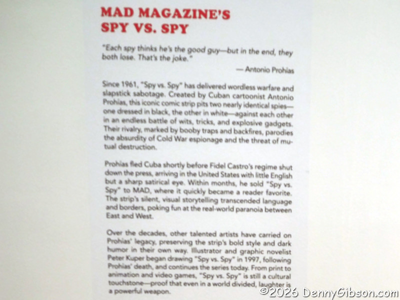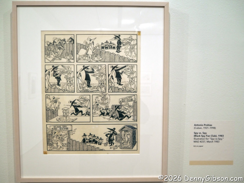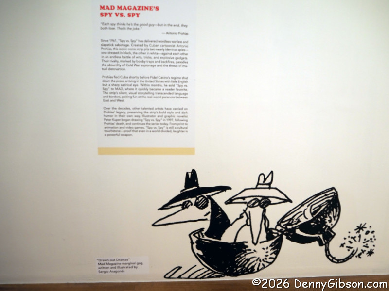 The exhibit is organized in a loose chronological sequence, and I was starting to get concerned about finding something on one of my favorite features. “Spy vs. Spy” came along in 1961, and I was well into the second half of the exhibit before these popped up. It’s pretty fuzzy, but there’s a slightly more readable version of that second image here. Incidentally, small sketches often appeared in the margins of the magazine, and that is sort of mimicked here with sketches on the walls, like the one with both spies in a bomb. Antonio Prohías, a Cuban refugee, originated the strip and drew it until 1987. The first pictured strip is his from March 1983. Peter Kuper picked up the strip full-time in 1997 and switched to color in 2001. The second pictured strip is his from June 2004. That one doesn’t work for me. That’s not in any way a dig on Kuper’s talent. I remember black-and-white drawings of a black character and a white character, each believing they were the good guy, even though it was starkly evident there was no difference between them at all. I suppose that’s still there with colored backgrounds, but it somehow seems less obvious.
