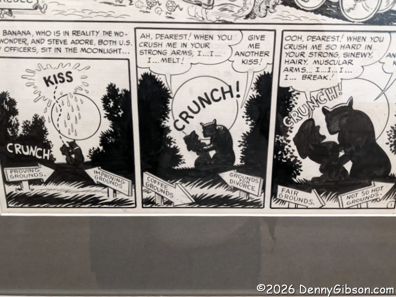 One of the things Mad Magazine did best was satirizing movies and TV shows. It also had a knack for slipping jokes into comic strips that had nothing to do with the story and which (at least in my case) might not even be caught until the second or third reading. This spoof of “Wonder Woman” is an example of both. Diana Banana (Woman Wonder) and Steve Adore engage in a silhouetted display of affection near signs pointing to “Proving Grounds”, “Inproving Grounds”, “Coffee Grounds”, etc.