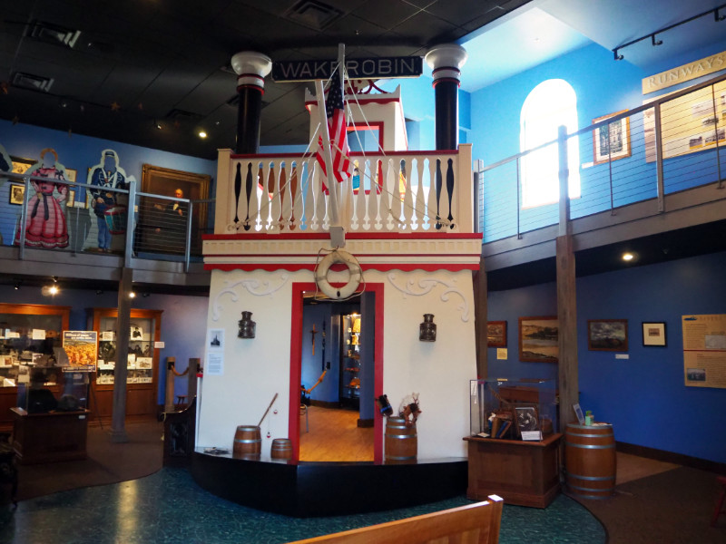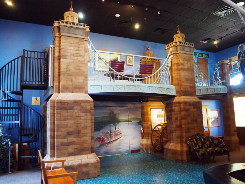 There are displays, including the upper deck of a USS Wake Robin mockup, in an adjacent area overlooking third-floor displays identified in the guide. They are reached by descending the spiral stairs or by elevator. The Wake Robin was built in 1926 as a lighthouse tender, became part of the Coast Guard fleet in 1938, then spent several of its later years as the USS Nightmare, a Halloween-themed attraction on Covington’s riverfront. Folks with a good imagination might see some similarity between the third picture and this blog’s page-topping image of the Delta Queen making its final departure from Cincinnati under the real Roebling Bridge.