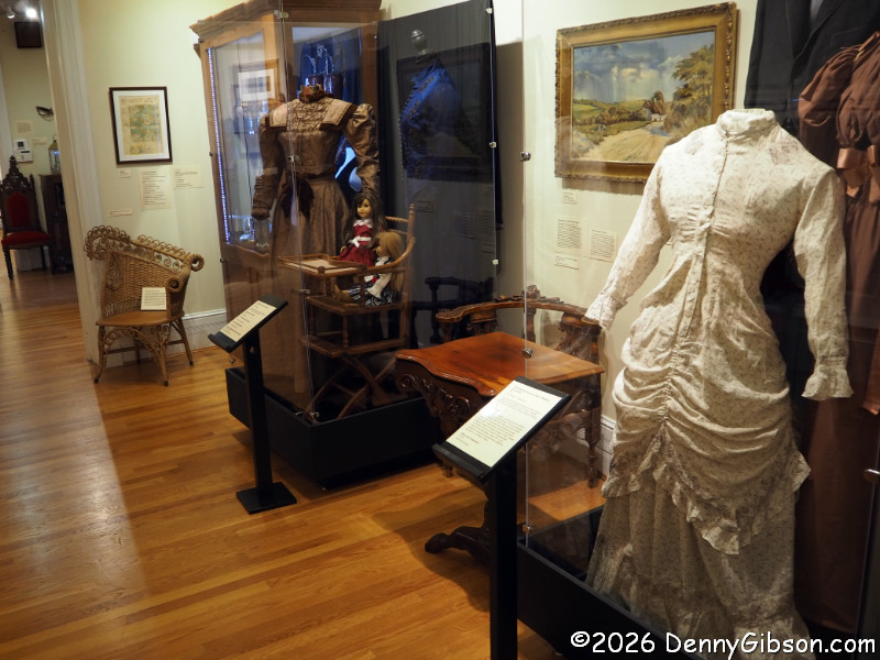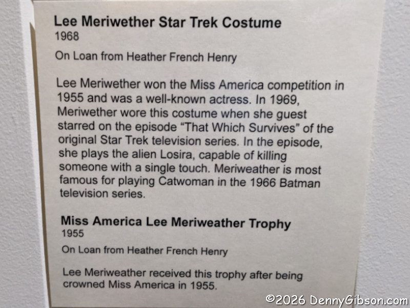 The third floor is also where temporary exhibits are displayed. This space is currently occupied by “Treasures From the Attic: 250 Years of Fashion and Furniture”. The middle photo is of Lee Meriwether’s costume from an appearance in Star Trek, along with her 1955 Miss America trophy. For some reason, both costume and trophy are currently in the possession of Augusta, KY, native and 2000 Miss America Heather French, as noted here. The gown in the third photo was worn by 1948 Miss America Bebe Shopp.