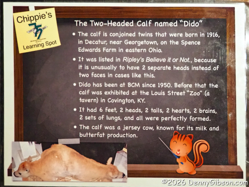 Obviously, the museum is a first-class operation with outstanding exhibits on the history of northern Kentucky. Ironically, its most infamous exhibit is a two-headed calf that was actually born in Ohio. It is certainly a most unusual creature. The placard in front of the case is here, and the paper inside the case is here.