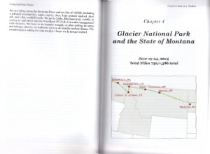 The book begins with descriptions of acquiring gear for the trip, physical training, shipping the bike, etc. Preparing their home world for a near three-month absence takes some effort, too. Once the trip is underway, each chapter begins with a map of the area covered in that chapter, and each day’s journal begins with the date, incremental and cumulative miles traveled, and a brief description of conditions. An example from a day in Montana is: