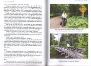 The idea of two different views is carried into the book’s text. Instead of collaborating on a single combined narrative, Tracey and Peter each write their own version of events, and the two versions are interleaved. Sometimes, the pair of synchronized tales differ by no more than the distance between tandem bicycle seats, and sometimes they offer very different takes on a single set of events.