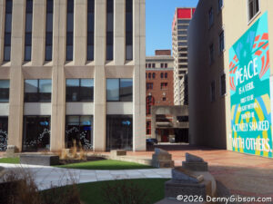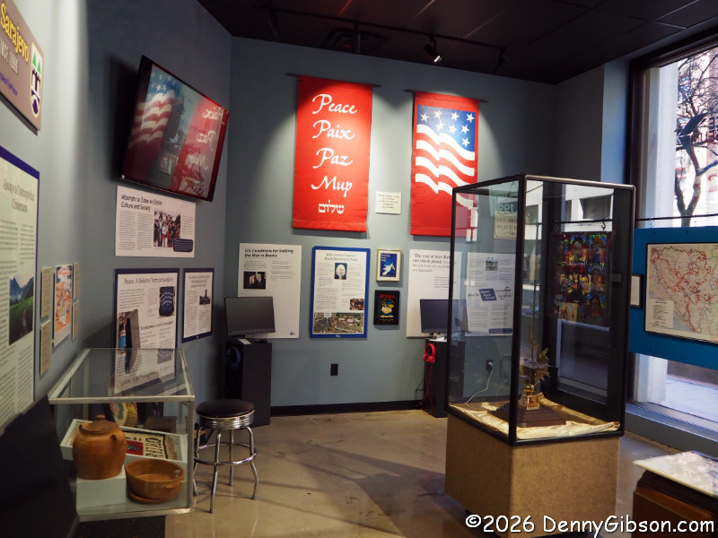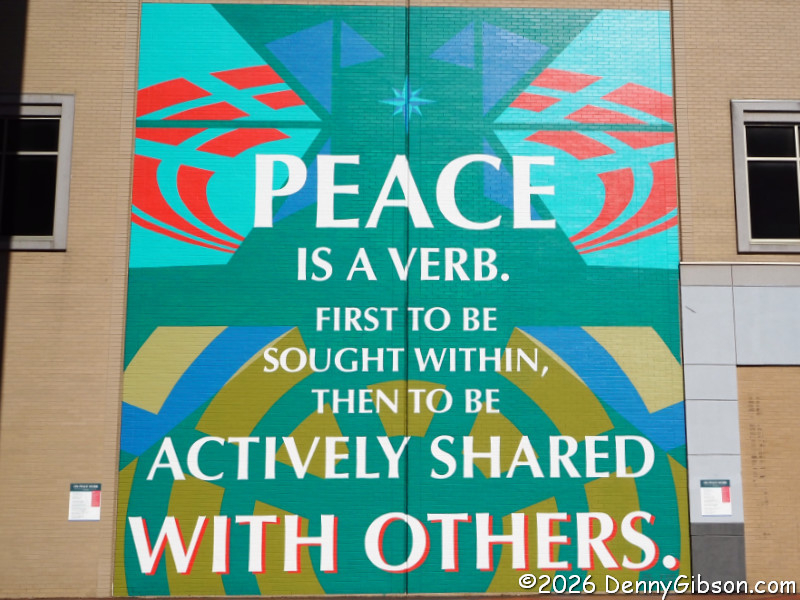 Another difference between this museum and those others is that the Peace Museum has moved since I last visited. It now shares a building with a Ludlow Street address, and that is how I entered. But the museum extends all the way through its half of the first floor and can be accessed from Courthouse Square. That’s the side pictured in the opening photo. A straight-on view of that mural is here, and of the adjacent text panel here.