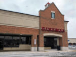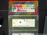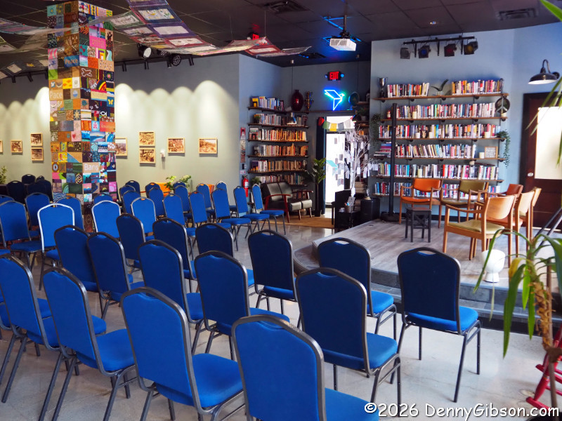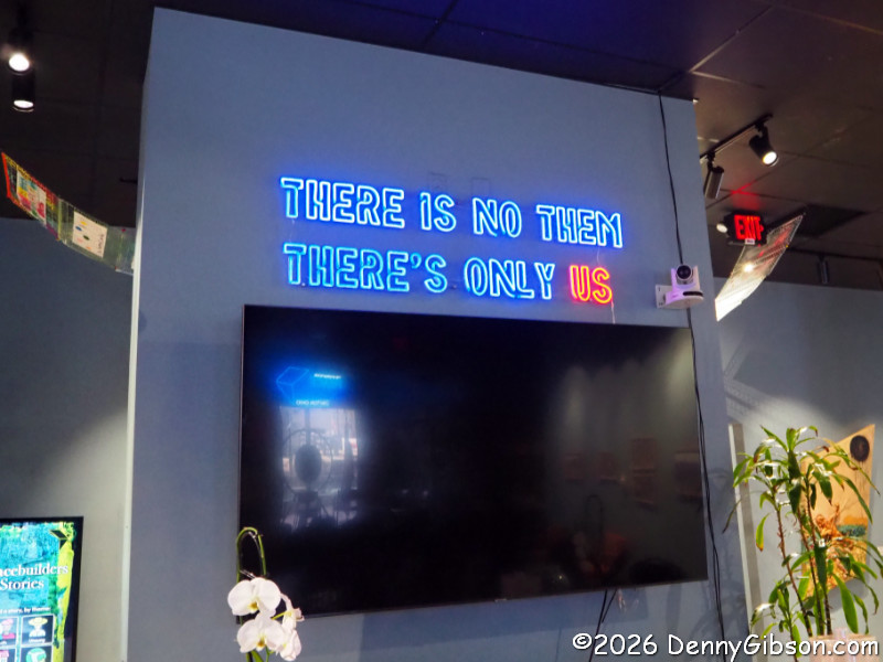 The lobby was set up for a presentation scheduled for later in the day. The column to the left of the first photo is called the Peach Pole. Among the images covering it, the word “peace” appears in the twenty most commonly spoken languages in Dayton. Hand-drawn panels hanging overhead make up an exhibit named “Bridges”. The lobby also contains a pretty cool neon sign.