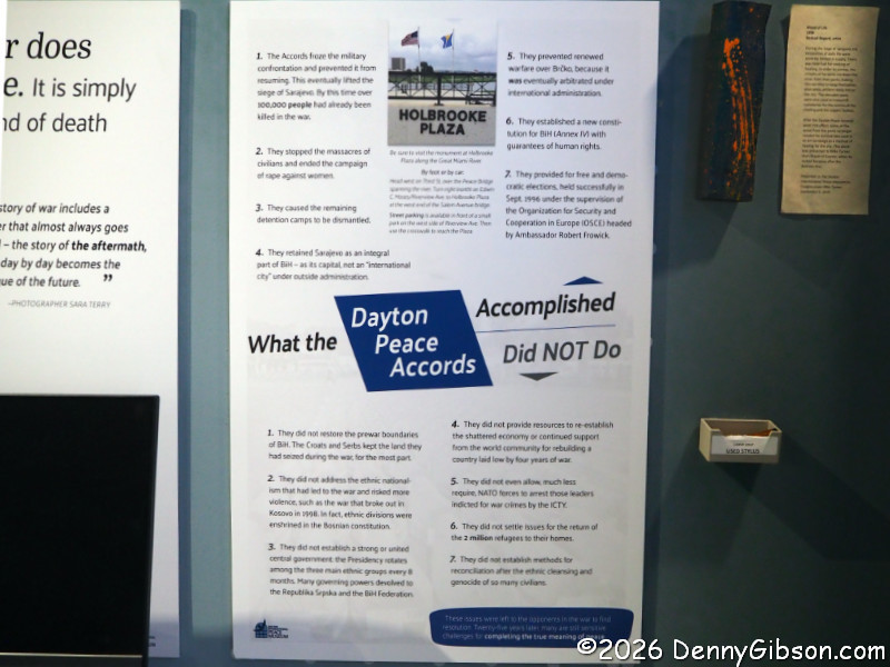 The founding of the International Peace Museum in Dayton in 2004 was at least partially an outgrowth of the city being the site of the signing of the Dayton Peace Accords in 1995, and the museum contains a sizable exhibit devoted to that event. The accords did end the violence of the Bosnian War, but, like so many agreements before and since, left lots of problems unsolved.