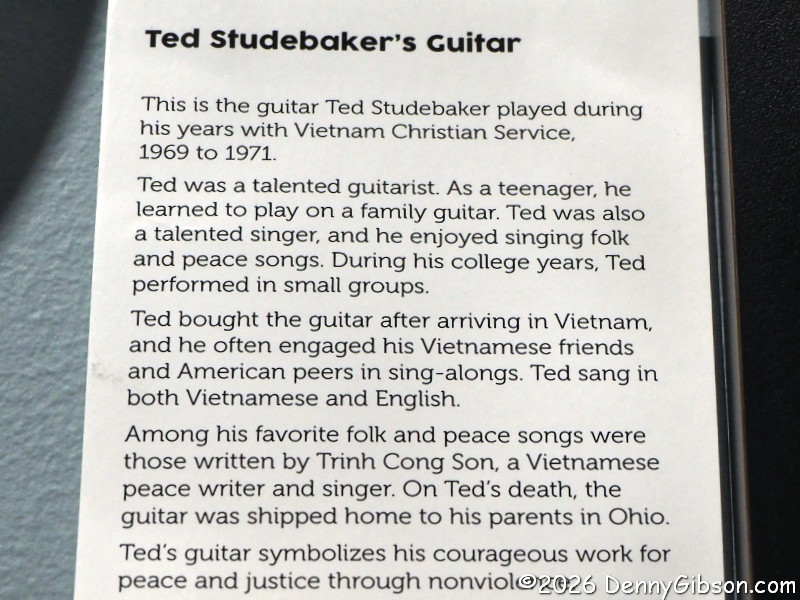 This guitar is the only item I distinctly remember from my 2009 visit. As described here, it belonged to conscientious objector  Ted Studebaker, who was killed in Vietnam in 1971 while helping farmers there. Studebaker was from nearby West Milton, OH.