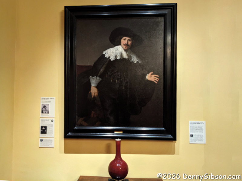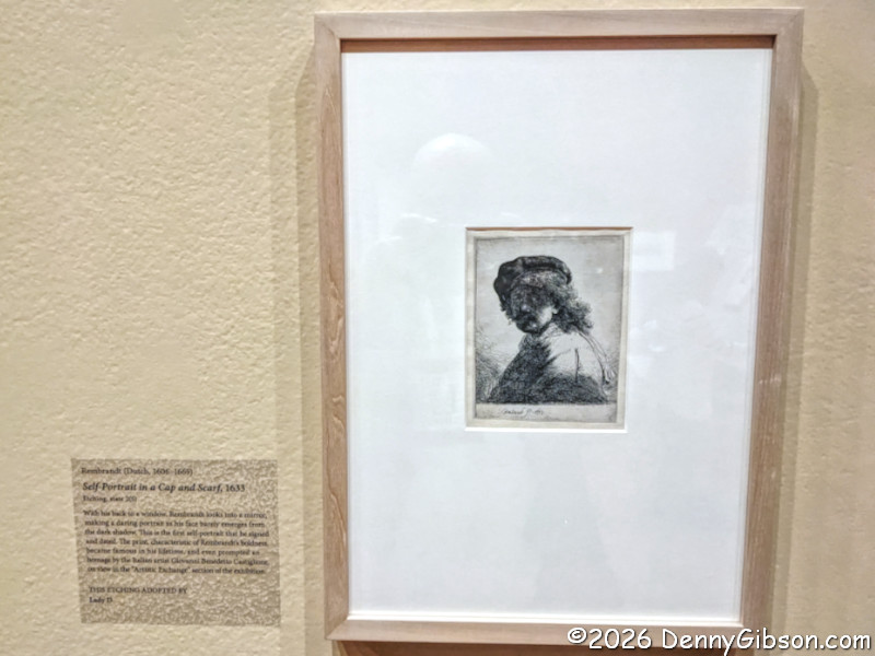 There are 49 prints from Rembrandt etchings on display, and, as noted and as can be seen, most are just a few inches in size. The cost of materials and a desire for portability were both reasons for this. Rembrandt made several self-portraits during his career, but this one from 1633 is said to be the first he signed and dated.