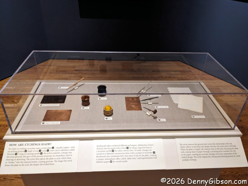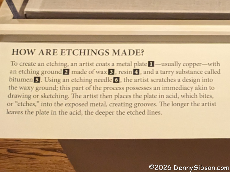 Since I know even less about etching than I do about almost every other art form, I found this display quite helpful. It seems the artist etches into a waxy layer applied to a copper plate, then acid does the etching into the metal.