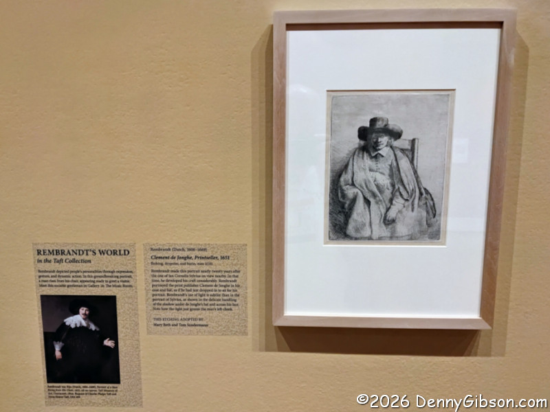 Admission to the Taft Museum of Art includes access to all permanent galleries, as well as this traveling exhibit of etchings from the Rembrandt House Museum in Amsterdam. Here is one of several connections between the two. This 1651 etching of Clement de Jonghe is cited as an example of Rembrant’s mastery of light and shadow and of his use of people’s expressions and gestures. The 1633 Portrait of a Man Rising from His Chair is an even better example of Rembrandt’s use of these.