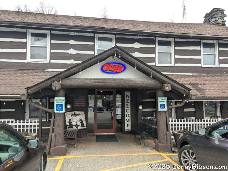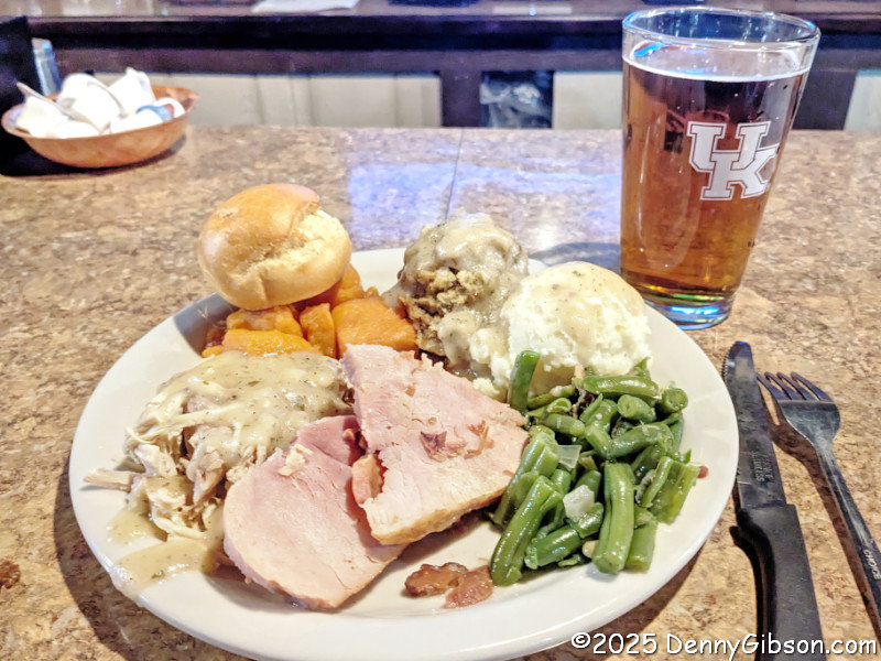 This actually was the first piece in this itinerary. Last year, as I drove south to that park near Hazard, KY, I was surprised to find the closer-to-home Log Cabin Inn open for breakfast. I was less surprised to find a Thanksgiving dinner was planned for later in the day. As the holiday approached this year, I was happy to learn that it was happening again and that reservations were not required. Last year, it had been sold out some days before I stopped for breakfast. I planned to stop on my way north and hope to get in. It was crowded, and a few people were waiting for seats, but I, as a party of one, was given a spot at the bar immediately. The fellow to my left, whom I chatted with later, was drinking from a pretty large mug, but fortunately, the barmaid offered me a choice of large or small. She did not offer a size choice on the meal, and I think I barely made it through half of the feast shown in the opening photo. Although it was too much for me, it was very good, and many customers thought the portions just right.