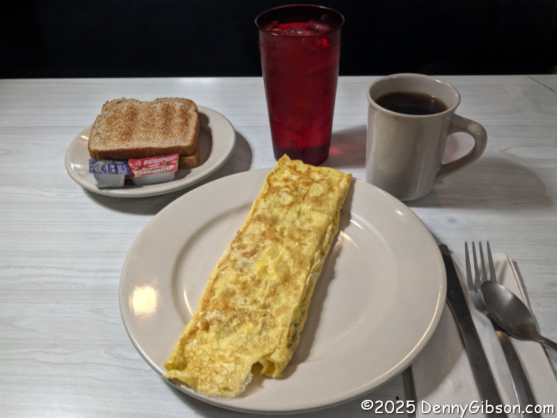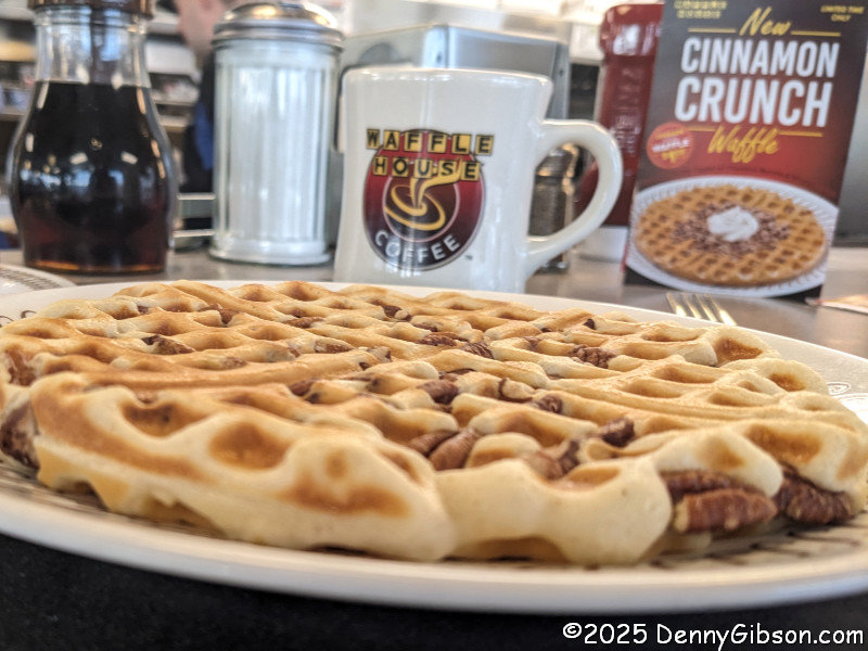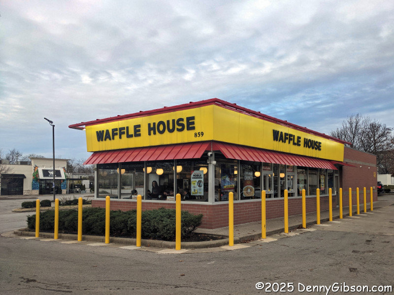 On Thanksgiving morning, it was possible, but not likely, that I would find an open independent breakfast spot further on up the road. It made no sense not to stop at this Waffle House barely half a mile away, directly on my planned path. Not only is Waffle House a reliable source of food on holidays, but it’s also a place where you are almost certain to find a friendly and cheerful staff. That was definitely the case here, where I started my day with a tasty pecan waffle.