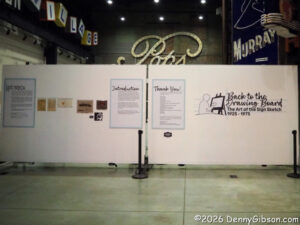 Items on the exhibit’s last panel, as well as many of the previous items, can hardly be described as sketches. Some of the older sketches had truly been salvaged from trash cans and dumpsters. Some items in this photo were borrowed from collections displayed in homes and on office walls. The exhibit provides some real insight into the design and marketing of signs, but doesn’t help at all — Tod’s “zeros” comment notwithstanding — in distinguishing fine art and commercial art.