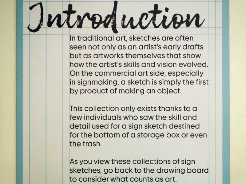 Sketches are big in Cincinnati right now. Last month, I looked over some sketches by Rembrandt at the Taft. Yesterday, I looked over some sketches by various sign designers at the American Sign Museum. I missed Thursday’s opening reception for the ASM’s Back to the Drawing Board: The Art of the Sign Sketch 1925-1975 exhibit, but made it to Saturday’s tour by ASM founder Tod Swormstedt. The introduction placard speaks of the difference in how commercial art and fine art are perceived and invites folks to “consider what counts as art”. Early in the tour, Tod shared his oft-repeated observation that “The difference between fine art and commercial art is the number of zeros in the price.”