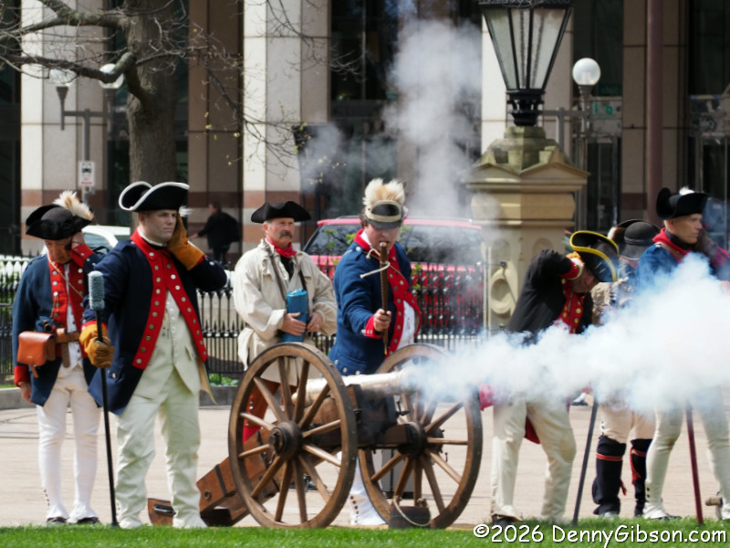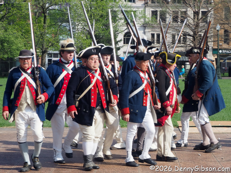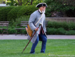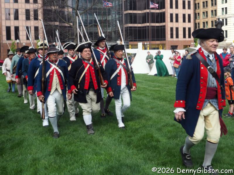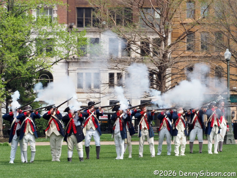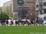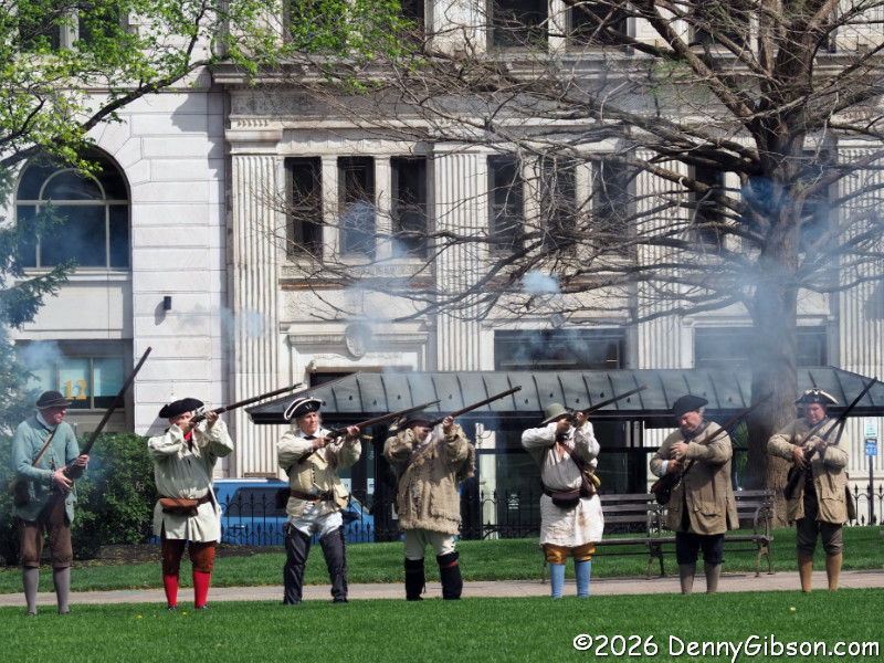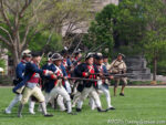 After marching to the far side of the lawn, both the militia and the uniformed regulars fired several volleys. (Note that the day this is being posted, April 19, 2026, is the 251st anniversary of men dressed and armed much like those in the first photo confronting British troops at Lexington and Concord.) Then the regulars begin moving toward the crowd. Half the group marched several paces ahead of the others and fired. They would then reload while the other half advanced and fired. Then, after crossing much of the lawn in this fashion, they all lowered their bayonets and charged,