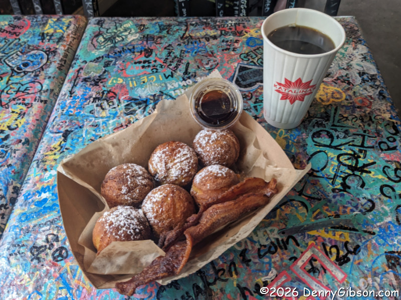 Another thing I could have learned from the D, D and D episode was how to eat the signature and absolutely delicious Pancake Balls. I briefly considered pouring the real Maple syrup on the Nutella-filled balls like I would on a flat pancake, but decided that probably wouldn’t work. I proceeded to tear pieces from the balls with fingers and fork, and dip the impaled pieces into the syrup. I’ve now seen the video and know that holding a ball in your fingers, dipping it into the syrup, then taking a bite, is what the cool kids do. Next time, I’ll be cool, too. I was already cool enough to use my fingers to eat the best bacon I’ve ever met.