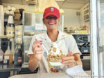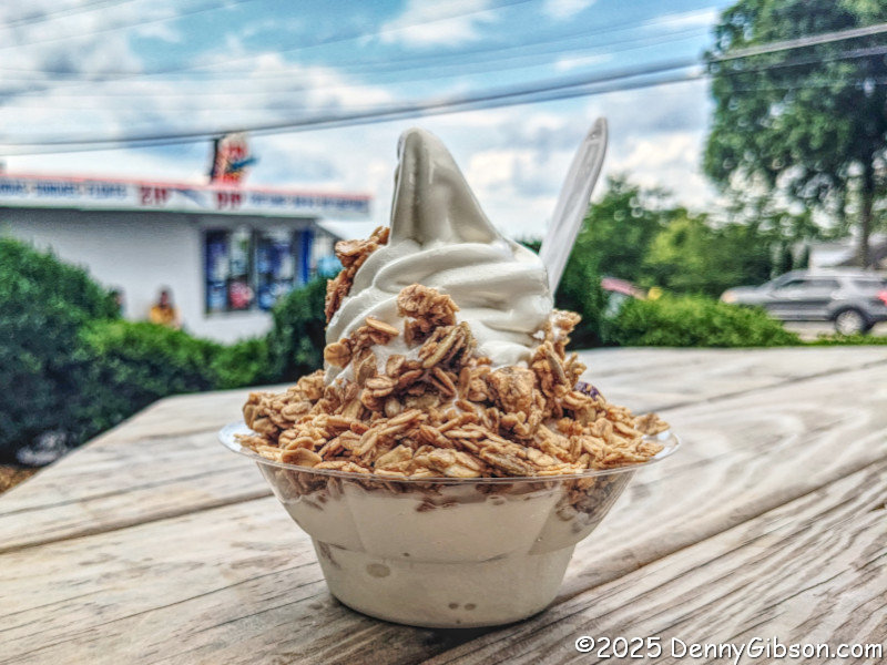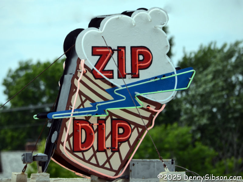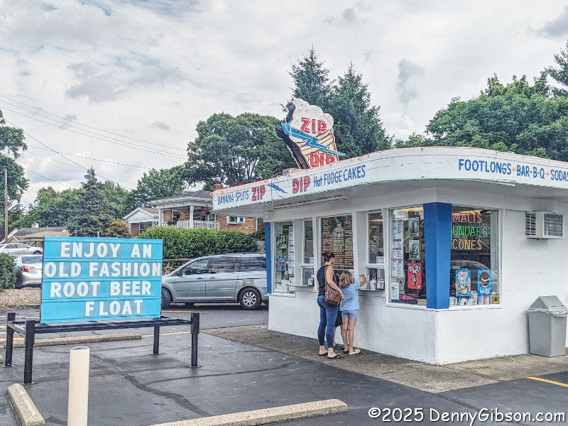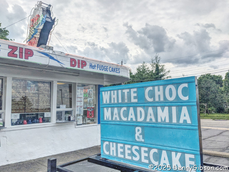 On that 80+ degree first day of Summer, the memory of a recent story about an ice cream stand’s anniversary prompted me to drive to the west side of town, and some sweet coolness. Zip-Dip opened for its 75th season in early March. Regular Summer hours went into effect on May 23. In addition to chocolate and vanilla soft serve, Zip-Dip offers orange sorbet and two rotating flavors of yogurt. I couldn’t have picked a better day for flavor choices.