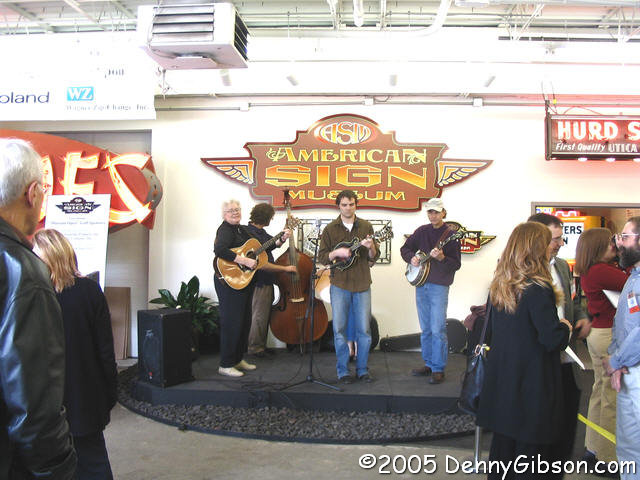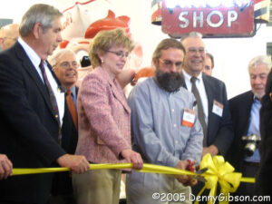 The picture of the ribbon-cutting at the April 28, 2005, grand opening at the top of this page is similar to a much better one appearing on page 97 of the 25-year book. The museum opened before this blog existed, and things that were not road trips appeared as Oddments. The Oddment for the 2005 opening is here. That’s the Katie Laur Band in the picture at left. While putting this post together, I found a couple of unpublished pictures from that day that I think deserve sharing. One is Katie Laur and “Mr Cincinnati” Jim Tarbell chatting as things wound down. The other is of Lenny Diaspro, to whom the 25-year book is dedicated and after whom the museum’s Lenny’ Bar is named. I remember Lenny as a tour guide and more in Camp Washington, but admit to not really being familiar with him at Essex Studios. Obviously, I should have been.