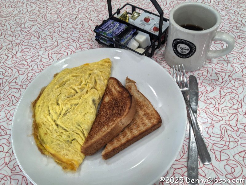 Once I had checked out all the cars, I went inside and don’t even pretend you’re surprised. There’s a real greeter with a real smile just out of frame to the left. I once again sat at the counter and watched as my meal was cooked. It was then delivered with a smile. This time it was a Local Omelet (goetta, onion, peppers, mushrooms, cheddar jack cheese). After eating, I carefully selected and then made use of one of the restrooms.