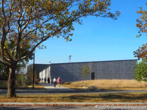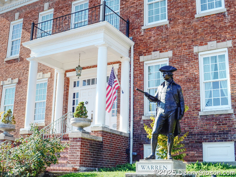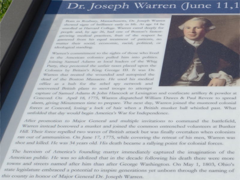 The entrance pictured at the top of this article is located at what might be considered the rear of the building, where it is conveniently near a parking lot. The front of the building faces Broadway, and that is where this statue of Warren County’s namesake, Dr. Joseph Warren, stands. The statue was dedicated just months ago on the 250th anniversary of Dr. Warren’s death at the Battle of Bunker Hill on June 17, 1775. A somewhat more readable version of the text on the sign is here. The QR code at the sign’s upper right leads here.