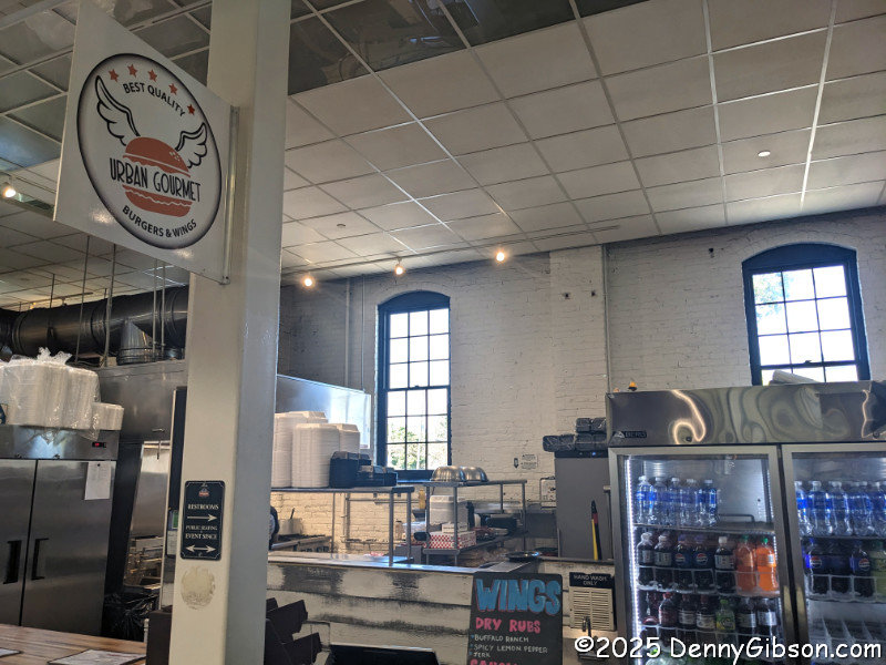 The space where basketball was once played is now surrounded by several shops, forming a sort of old-time town square.