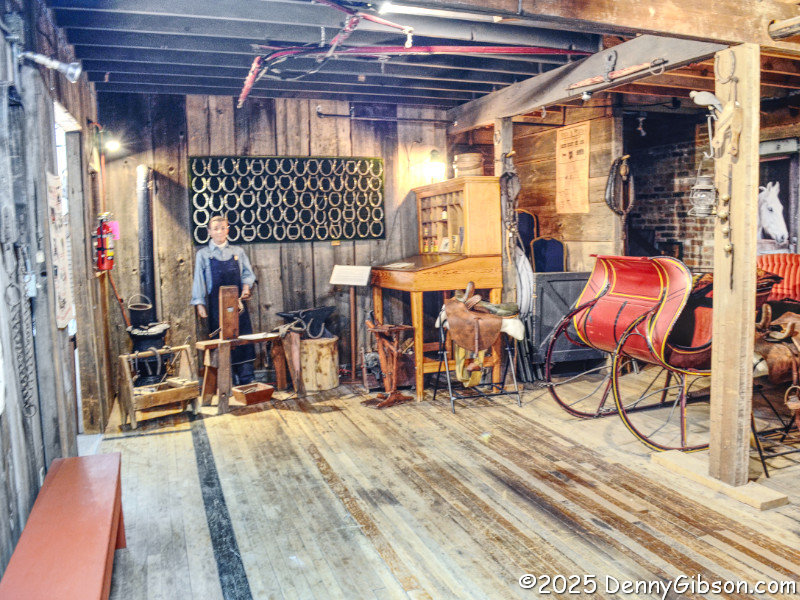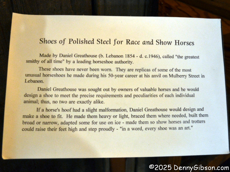 The museum is well organized, but there is no single correct path through it. That’s even more the case when you make a pass taking advantage of someone’s favorites before falling into your own meandering. There was very little coherent sequencing in the preceding photos, and there is even less from here on out. This is simply a trio of my own favorites. The IBM time clock was purchased in 1947 by the previously mentioned Oregonia Bridge Company. Read about it here. The most interesting thing for me in the blacksmith shop is the framed shoes on the wall. Read about them here. The furniture in the last photo came from the Glendower Historic Mansion. I learned today that the mansion was home to the first incarnation of the Warren County Historical Society Museum. Over the years, it was owned and administered by the WCHS and the Ohio History Connection. Most recently, the WCHS was the owner. It closed in 2022 and is now a private residence. I visited it during a period when OHC owned it.