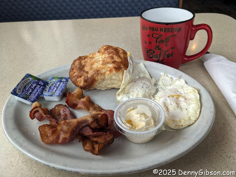 Today got started, well after sunrise, at Flo's Route 66 Diner. I believe almost every mention of this place that I've seen mentions really good biscuits and gravy. That's not something I wanted this morning, but all that attention did prompt me to order a biscuit instead of my normal wheat toast. It was an excellent choice.