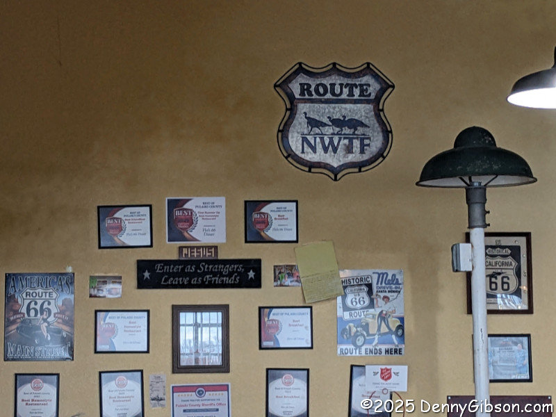It was kind of refreshing seeing Route 66 signs in a restaurant that was actually on Route 66. One was a bit unusual, but still looked familiar. I eventually recalled it being in the background of a photo of friends at a restaurant in Virginia. Another sign puzzled me so I asked my waitress about it, but she didn't know. An online search revealed that the logo identifies the National Wild Turkey Federation. It's use on a US Highway shield just might be a one time thing.