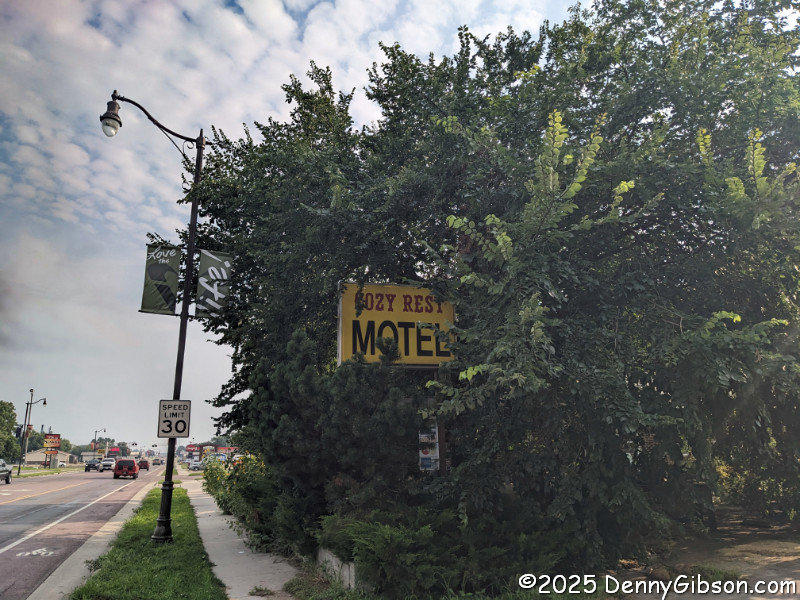 My first stop in Luverne, MN, was not at this motel but at a brewery. Searching by voice as I drove had turned up a motel from a chain I sometimes use and I halfway planned to stay there. But while I sipped a beer at the brewery, I scanned reviews and decided otherwise. Most reviews of the chain location were negative, while almost all reviews of the Cozy Rest were positive in one regard. Several said it was badly overgrown and hard to see and that the cat aroma in the office area was nearly overwhelming, but just about all of them said the rooms, though neither modern nor fancy, were clean and quite satisfactory. All of that -- overgrowth, cat smell, and clean rooms (including mine) -- was true.