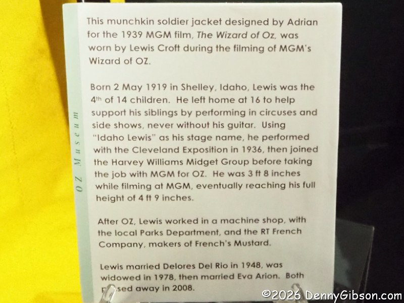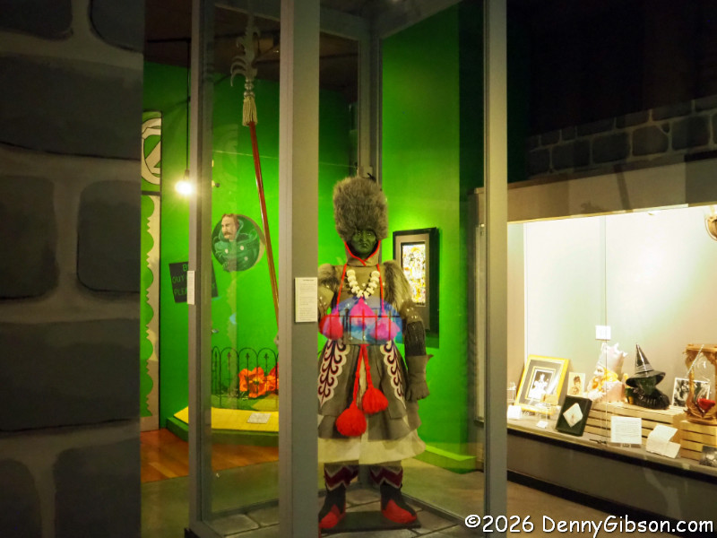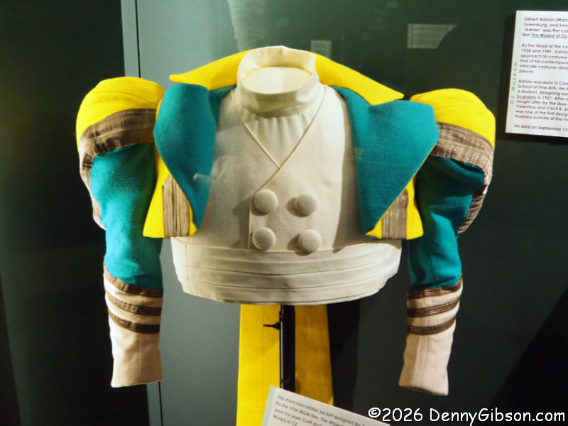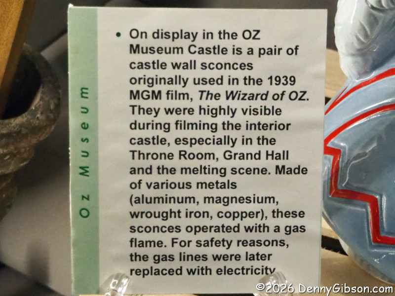 The Munchkin jacket was worn by 3' 8" Lewis Croft. The wall sconces are displayed in two different cases. The "gun" was carried by Frank Morgan. I read a placard about the Winkie spear being in the movie but failed to get a photo. |