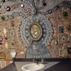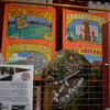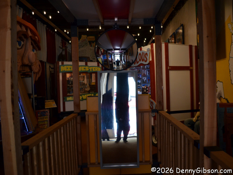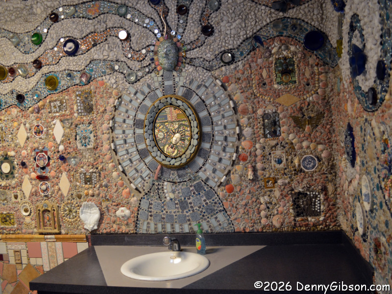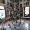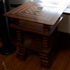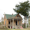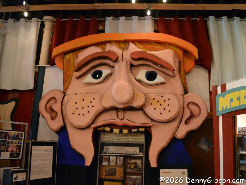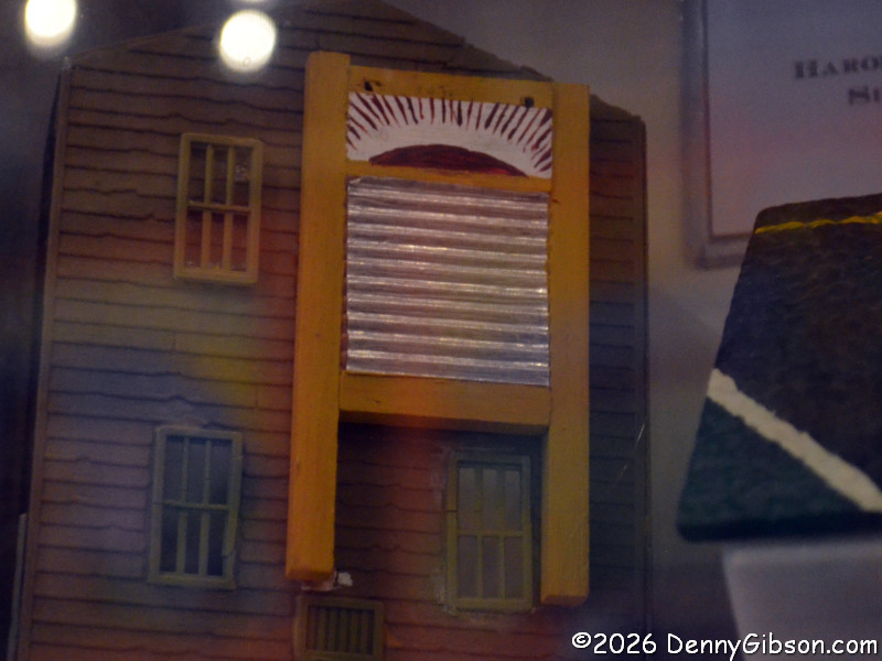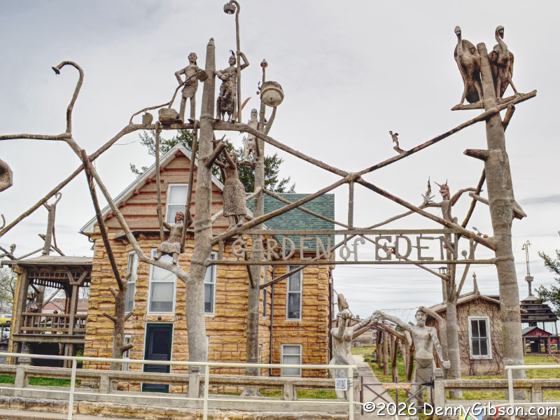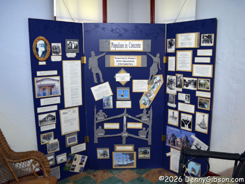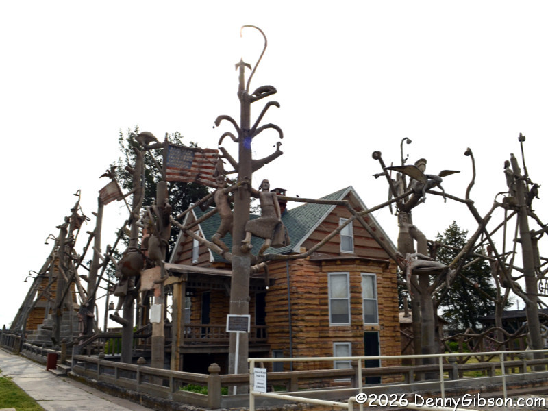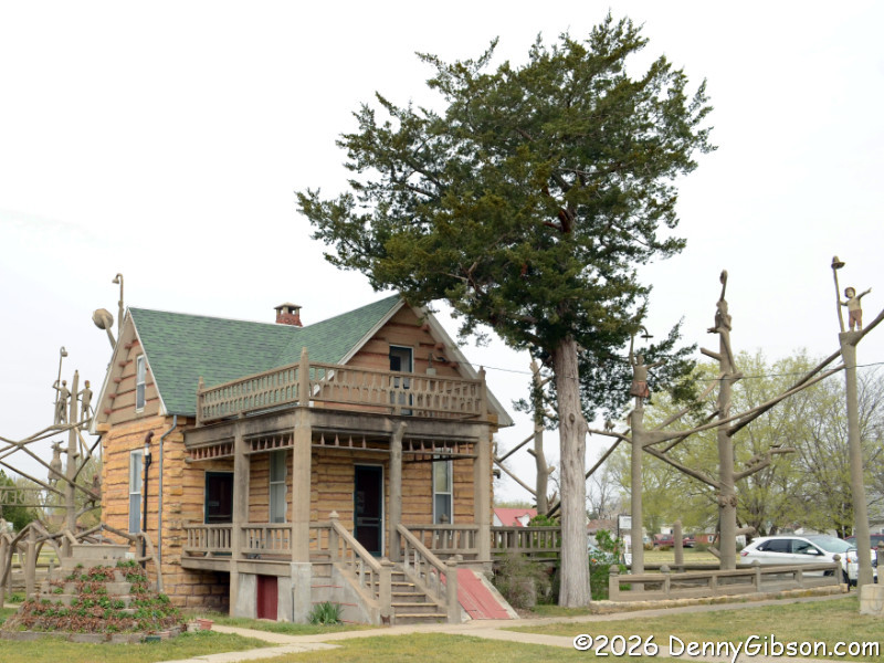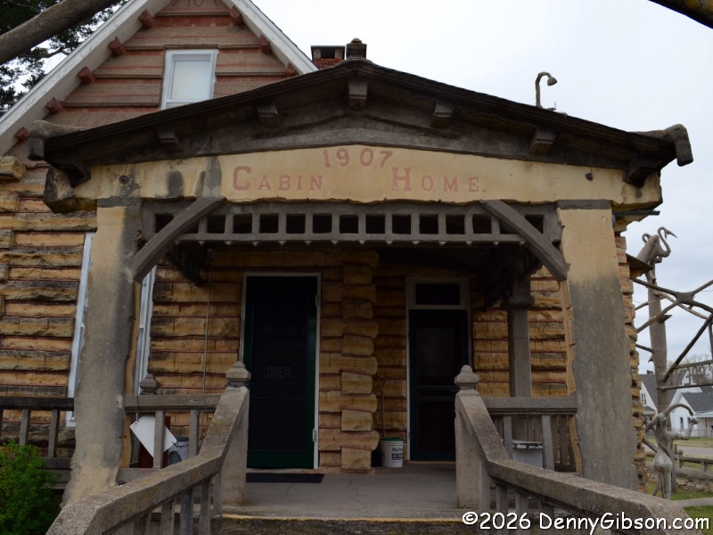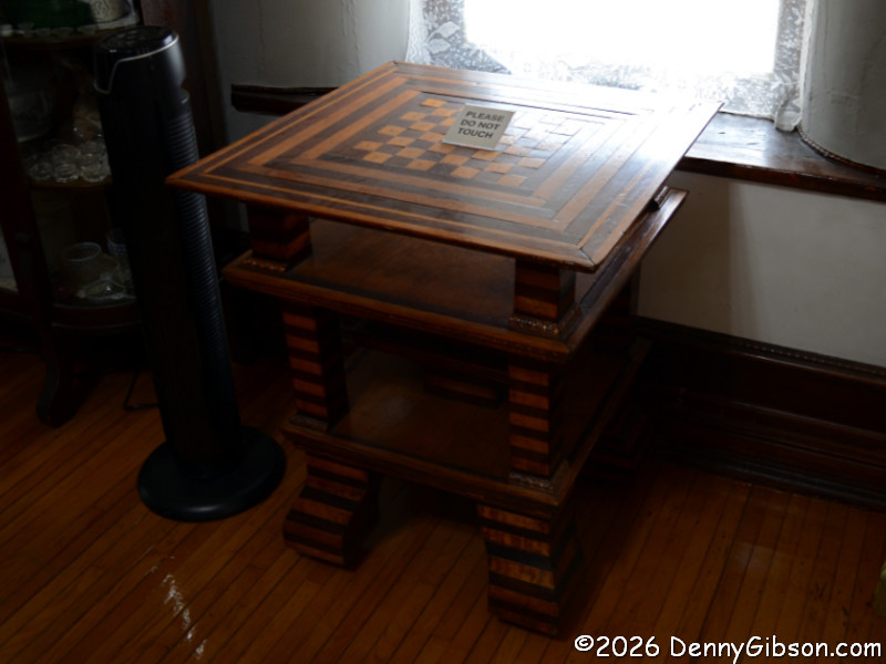 You really need to read a biography of the extremely interesting S. P. Dinsmoor (Wikipedia version here), but here are a few highlights. He was born in Ohio, served in the Civil War, moved to Kansas with his wife and family. He retired from farming and began building the Garden of Eden at the age of 62. When his first wife died in 1917, he retrieved her body from the city cemetery and buried her under concrete in the mausoleum in the back yard where he is also is interred. He married for a second time at age 81 to a woman 59 years his junior. The cabin was built as a tourist attraction to provide income. The gaming table is one of only a few items remaining in the cabin built by Dinsmoor. |