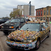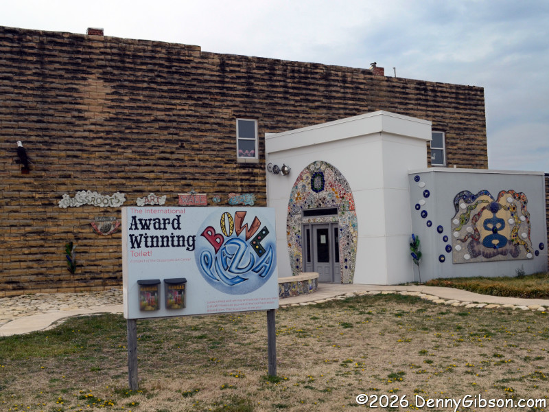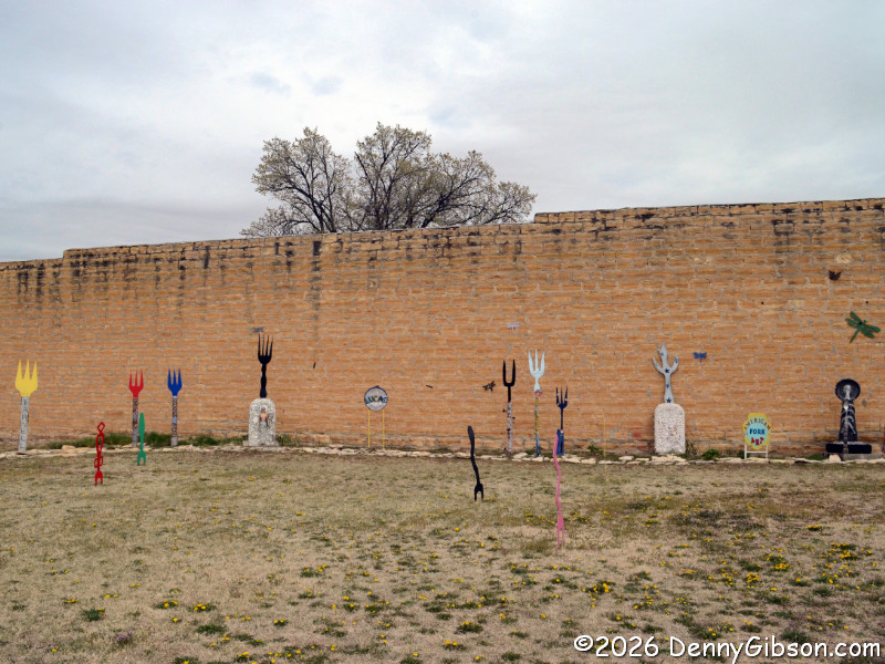 Folk and fork art border the park area next to Bowl Plaza. Up the street,