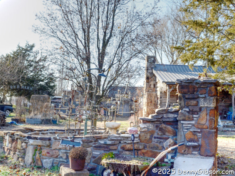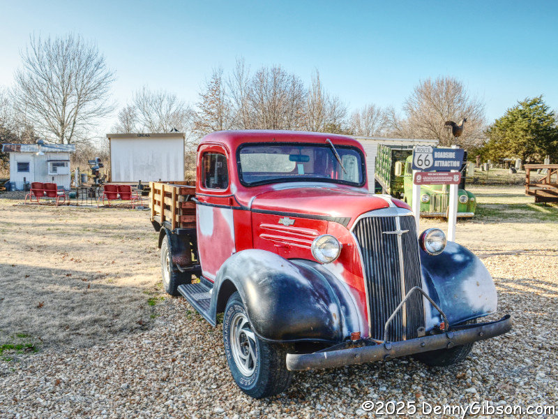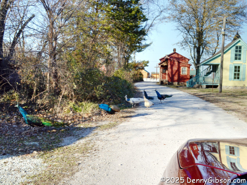 I slipped slightly off route to cruise through Red Oak II. That's the fountain where Lowell Davis posed for a photo when we first met. Yes, that Chevy truck is really cool, but don't ignore the open-air cinema just behind it. Of course, I wanted to know why the peacocks crossed the road, but they weren't talking.